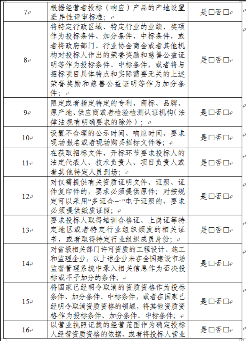 16.以营业执照记载的经营范围作为确定投标人经营资质资格的依据,或者将投标人营业执照记载的经营范围采用某种特定表述或者明确记载某个特定经营范围细项作为投标条件、加分条件、中标条件,或者以招标项目超出投标人营业执照记载的经营范围为由限制投标;