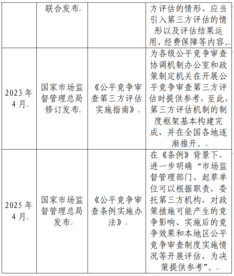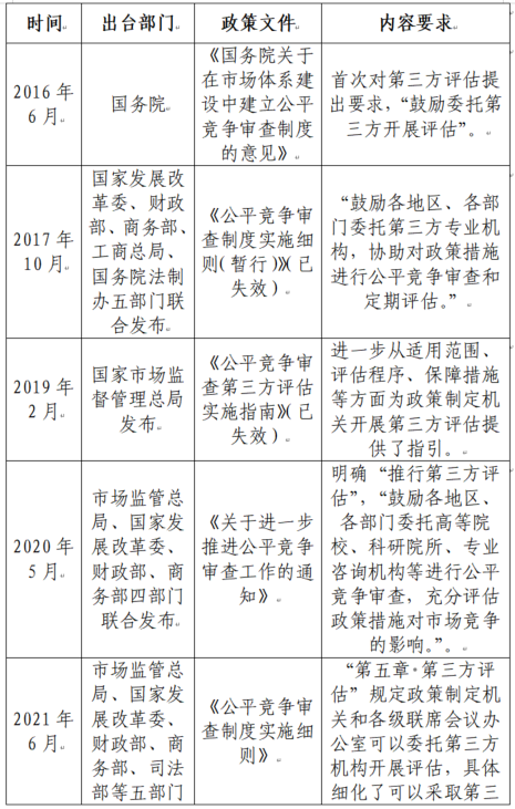 国务院和有关部门高度重视公平竞争审查第三方评估工作,先后制定出台了《国务院关于在市场体系建设中建立公平竞争审查制度的意见》《公平竞争审查制度实施细则(暂行)》《公平竞争审查第三方评估实施指南》《关于进一步推进公平竞争审查工作的通知》《公平竞争审查制度实施细则》《公平竞争审查第三方评估实施指南》《公平竞争审查条例实施办法》等一系列政策措施,明确和规范公平竞争审查第三方评估工作,具体见表1。